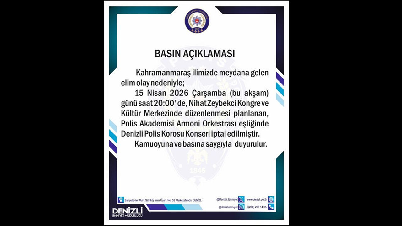 Denizli Emniyet Müdürlüğü'nden yapılan yazılı açıklamada, sanatseverlerin ve vatandaşların katılımıyla gerçekleştirilmesi beklenen etkinlik alınan iptal kararı kamuoyuyla paylaşıldı. Yapılan resmi duyuruda, 15 Nisan 2026 Çarşamba günü (bugün) saat 20.00'de Nihat Zeybekci Kongre ve Kültür Merkezi'nde, Polis Akademisi Armoni Orkestrası eşliğinde düzenlenmesi planlanan Denizli Polis Korosu konserinin, Kahramanmaraş'ta yaşanan üzücü olay sebebiyle yapılmayacağı belirtildi.