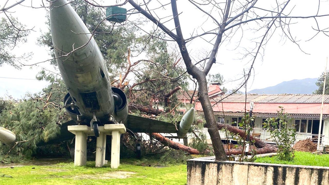 Denizli’de etkili olan şiddetli rüzgar, kent genelinde hayatı olumsuz etkilerken, kentin simgelerinden biri daha zarar gördü. Denizli Teknik Bilimler Meslek Yüksekokulu bahçesinde sergilenen ve uzun yıllar "uçaklı okul" olarak bilinen yerleşkenin sembolü haline gelen uçak, fırtınada devrilen çam ağacının hedefi oldu.